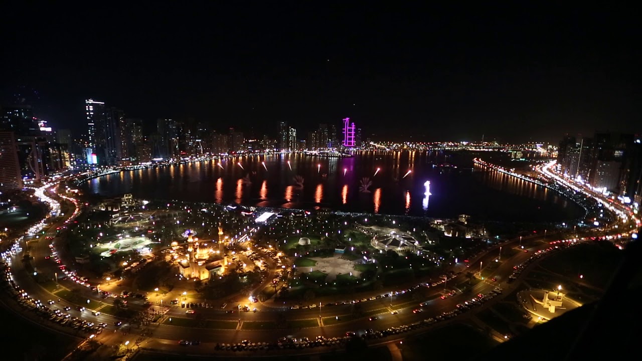 لوحاتٌ بصريةٌ خلابة سماء أضاءت سماء الإمارة الباسمة في واجهة المجاز المائية التي استقبلت العام الجديد بأضخم عرض للألعاب النارية في الشارقة والذي استمر لمدة عشر دقائق.