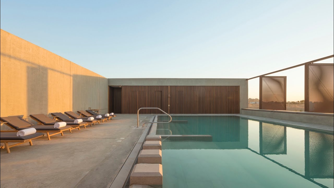 The hotel is a renovation of a petrol pumping site, where an abandoned cluster of buildings have been transformed into a five-room boutique hotel with a saltwater spa and open-air swimming pool by London-based studio Anarchitect.